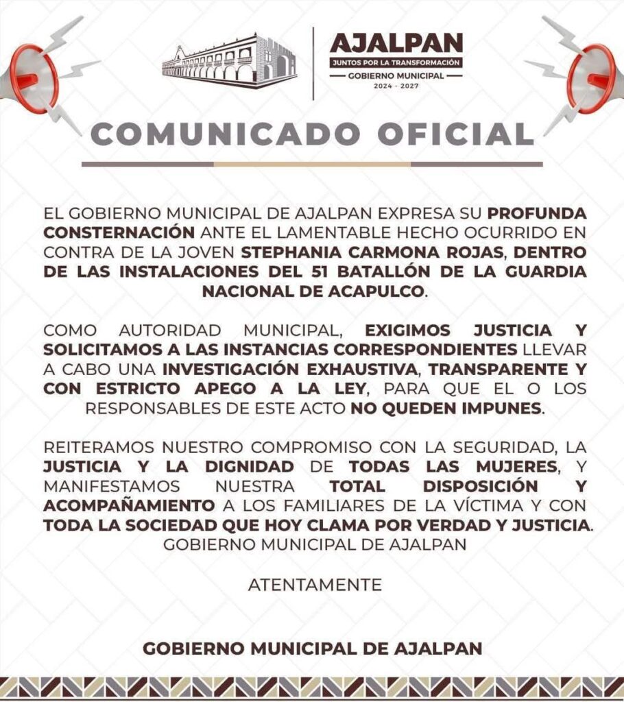 El gobierno de Ajalpan, Puebla, emitió un comunicado en el que exigió justicia solicitó a las instancias correspondientes llevar a cabo una investigación exhaustiva, transparente y con estricto apego a la ley.