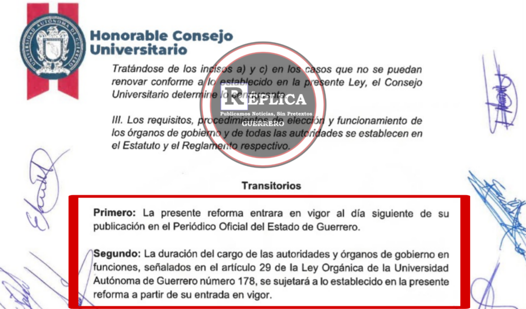 El artículo 1 transitorio en la propuesta aprobada por el Consejo Universitario señala que: “La presente reforma entrará en vigor al día siguiente de su publicación en el Periódico Oficial del Estado de Guerrero”.