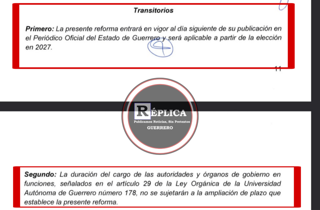 El artículo 2 transitorio de la propuesta de la Universidad señala que: “La duración del cargo de las autoridades y órganos de gobierno en funciones, señalados en el artículo 29 de la Ley Orgánica de la Universidad Autónoma de Guerrero número 178, se sujetará a lo establecido en la presente reforma a partir de su entrada en vigor”; es decir que, la ampliación a 6 años en el cargo sería aplicable para los actuales funcionarios en cuanto la ley se publicara en el Periódico Oficial del Estado.