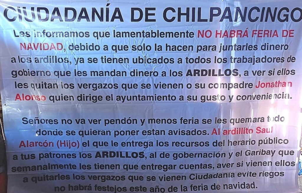 El miércoles de la semana pasada, el alcalde Gustavo Alarcón publicó en Facebook un oficio dirigido al secretario de Seguridad Pública federal, Omar García Harfuch, solicitando refuerzos policiacos para Chilpancingo, tras la aparición de lonas en las que se leían amenazas hacia la Feria de Chilpancingo, colusión de su gobierno con el grupo delictivo de Los Ardillos, y nombres como el de su hijo, Saul Alarcón, y el de «Garibay», que corresponde al apellido de Desarrollo Urbano del municipio, David Garibay.