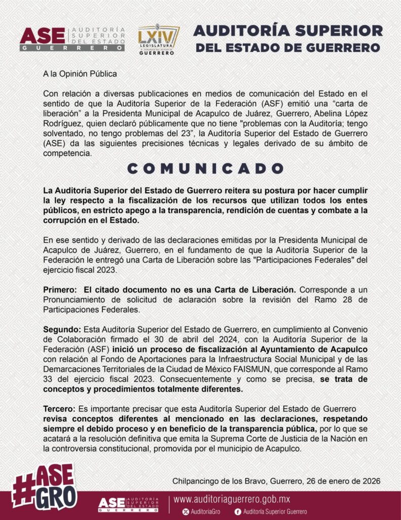 «Esta Auditoría Superior del Estado de Guerrero, en cumplimiento al Convenio de Colaboración firmado el 30 de abril del 2024, con la Auditoría Superior de la Federación (ASF) inició un proceso de fiscalización al Ayuntamiento de Acapulco con relación al Fondo de Aportaciones para la Infraestructura Social Municipal y de las Demarcaciones Territoriales de la Ciudad de México FAISMUN, que corresponde al Ramo 33 del ejercicio fiscal 2023. Consecuentemente y como se precisa, se trata de conceptos y procedimientos totalmente diferentes», indicó la ASE.