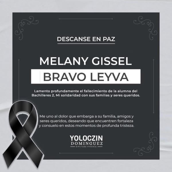 Alrededor del mediodia de este jueves murió la joven Melany Bravo Leyva, alumna del Colegio de Bachilleres plantel 2, que resultó herida en la balacera registrada esta mañana a las afueras de la escuela.