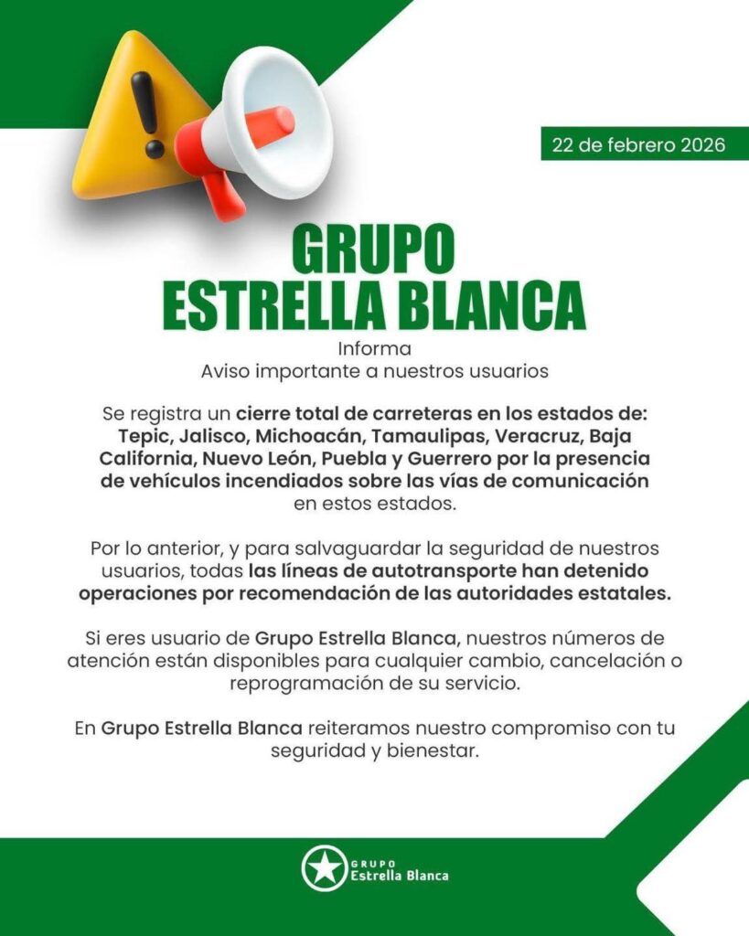 Grupo Estrella Blanca publicó un comunicado en el que han detenido todas las operaciones por recomendación de autoridades estatales.