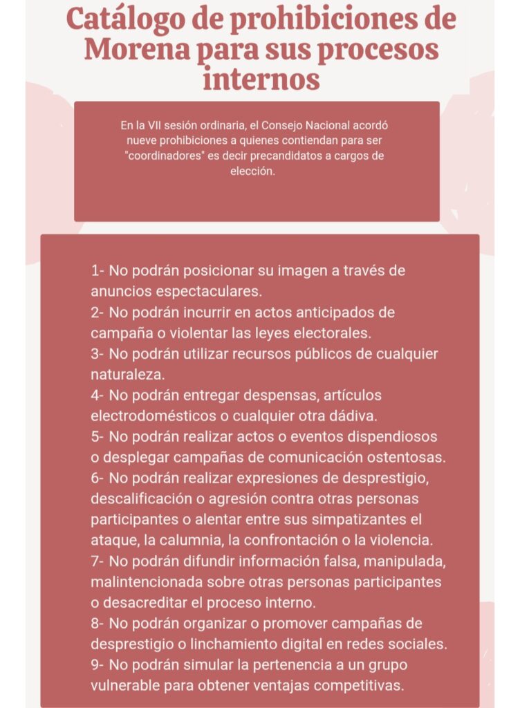 En su Consejo Nacional del 7 de marzo, Morena acordó que los aspirantes a defensores de la 4T, es decir, a candidatos de elección popular, tendrían que abstenerse de realizar cualquier acto de promoción, además de una serie de prohibiciones.